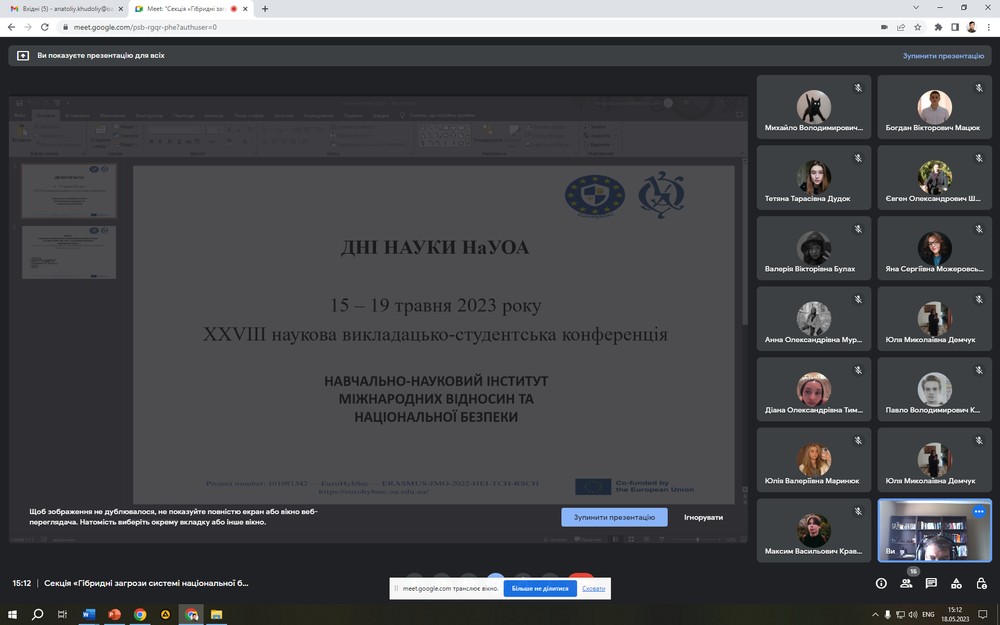 On May 18th, as part of the Days of Science – 2023 and within the framework of the implementation of the Jean Monet project “Self-Regulated Studies of Hybrid Threats and European Security”, a meeting of the Section “Hybrid Threats to the National Security System of Ukraine” section occurred at the National University of Ostroh Academy.