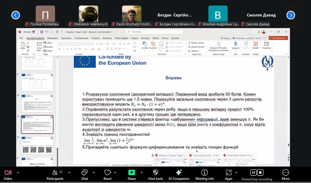 The program was delivered online and provided a full academic cycle equivalent to 5 ECTS credits, integrating a theoretical component on European security studies, policies to counter hybrid threats, and applied mathematical modeling of information processes. A total of 56 participants—higher education students and young professionals—took part in the program, enabling the achievement of planned outreach targets and the formation of a target audience with heightened awareness of disinformation mechanisms and information warfare analytics tools.