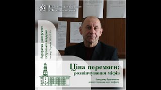 До Дня пам’яті та примирення і Дня перемоги над нацизмом у Другій світовій війні, у рамках проєкту «Відкритий університет Острозької академії», 7 травня відбулася онлайн-лекція "Ціна перемоги: розвінчування міфів". Лектор — доктор історичних наук, професор, завідувач кафедри історії ім. проф. М. П. Ковальського Володимир Трофимович. Під час зустрічі були обговорені маловідомі та дражливі сторінки воєнних випробувань українського народу в роки Другої світової війни.