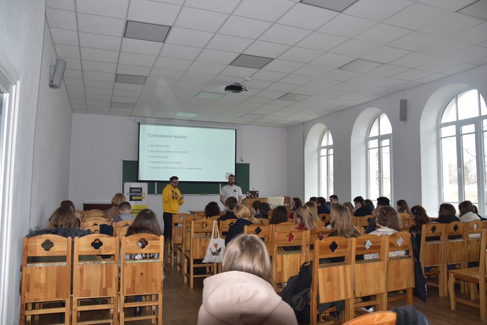 Перше заняття, на тему «Базові навички оратора», відбулося 28 лютого за участю спікерів київської Школи ораторської майстерності Максима Ющенка та Михайла Гнилоскуренка.