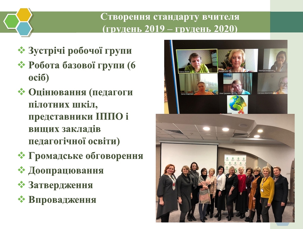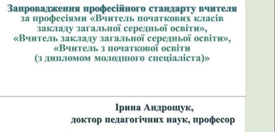 Ірина Андрощук показала презентацію на тему “Запровадження професійного стандарту вчителя за професіями «Вчитель початкових класів закладу загальної середньої освіти», «Вчитель закладу загальної середньої освіти», «Вчитель з початкової освіти (з дипломом молодшого спеціаліста)» й поділилася досвідом створення стандарту вчителя (період грудень 2019-грудень 2020). За словами пані Ірини, 5 ключових засад формування стандарту сучасного вчителя – це: