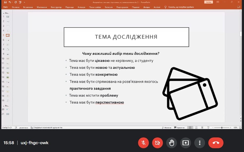 Наприкінці зустрічі спікерка закцентувала увагу на структурі академічного тексту, яка містить вступ, дослідницьку частину, основний текст і висновки.