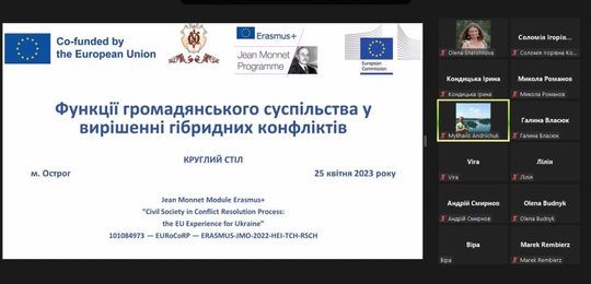 У межах проєкту «Громадянське суспільство у процесі вирішення конфліктів: досвід ЄС для України» в Національному університеті «Острозька академія» 25 квітня відбувся круглий стіл «Функції громадянського суспільства у вирішенні гібридних конфліктів».