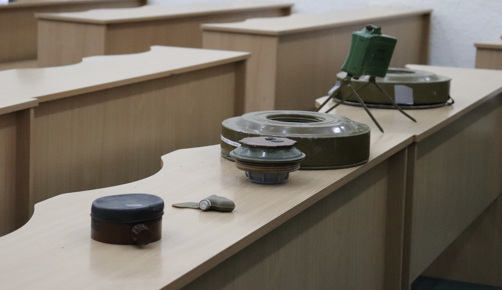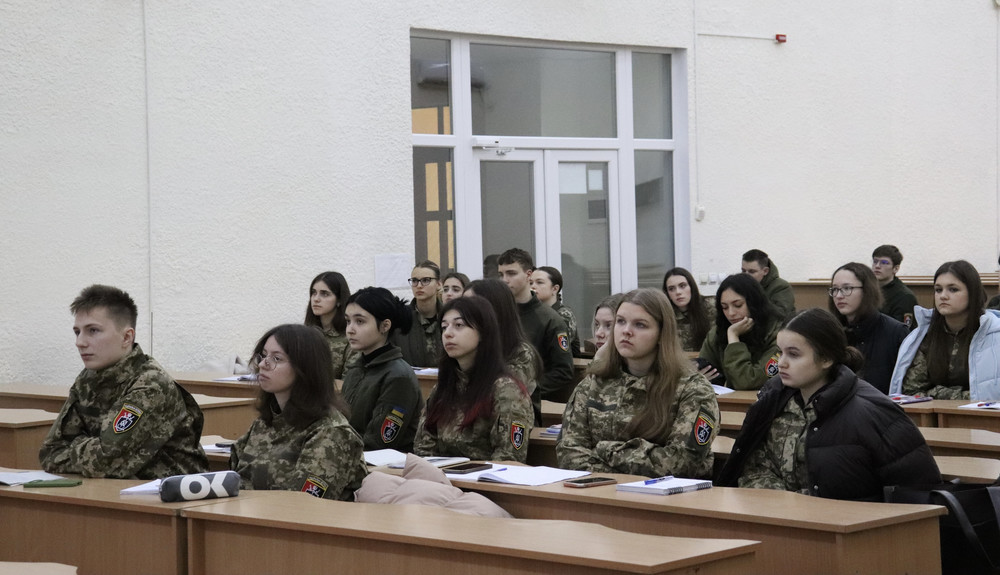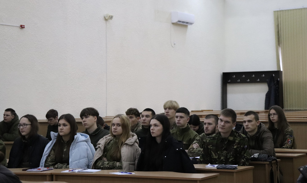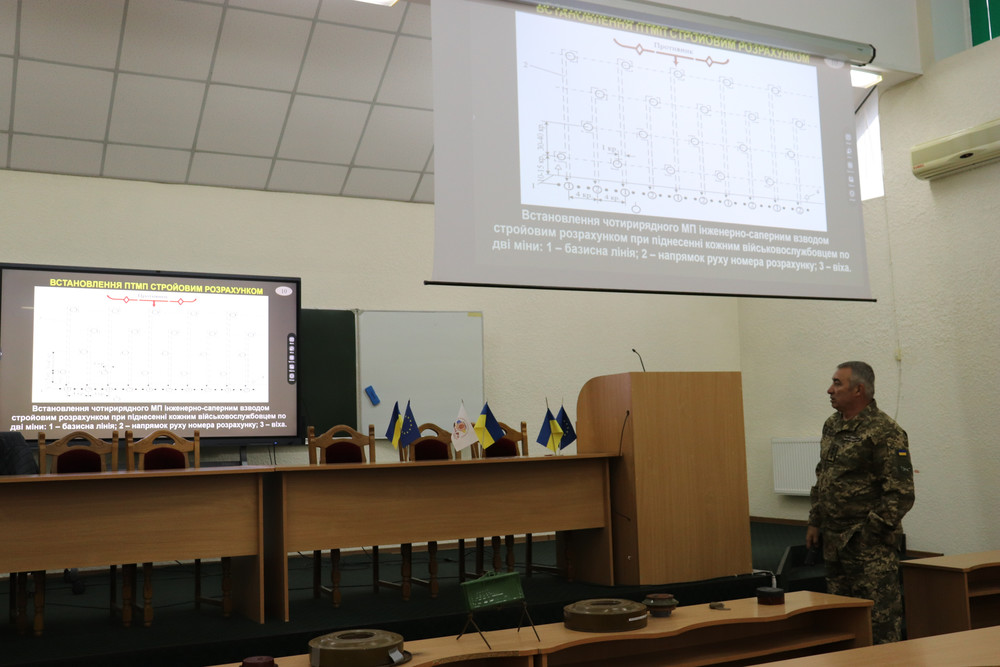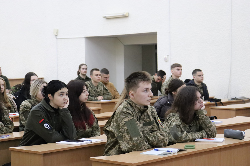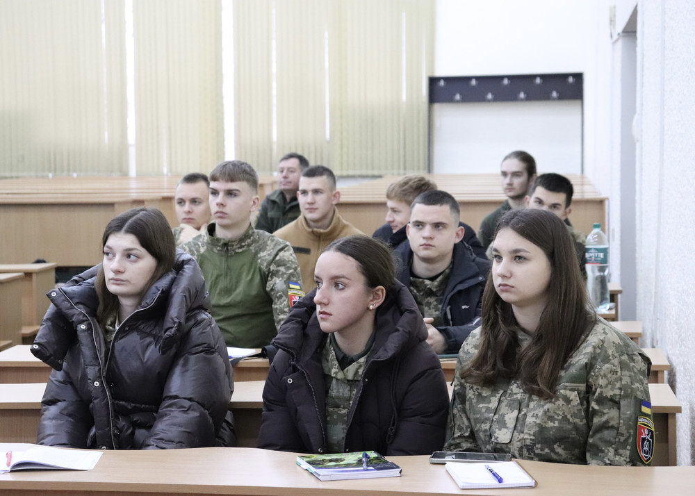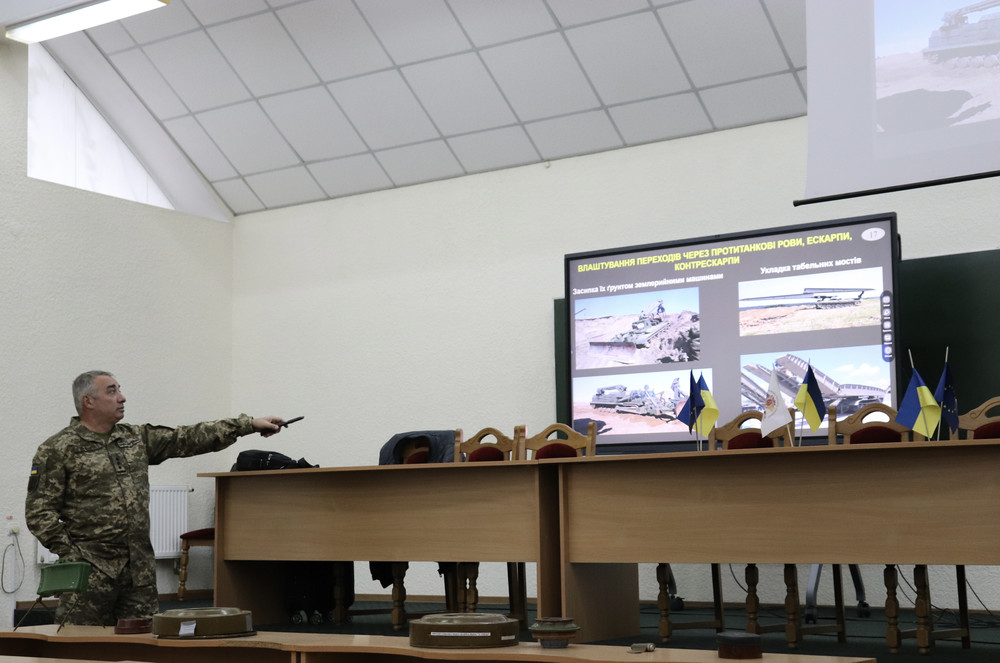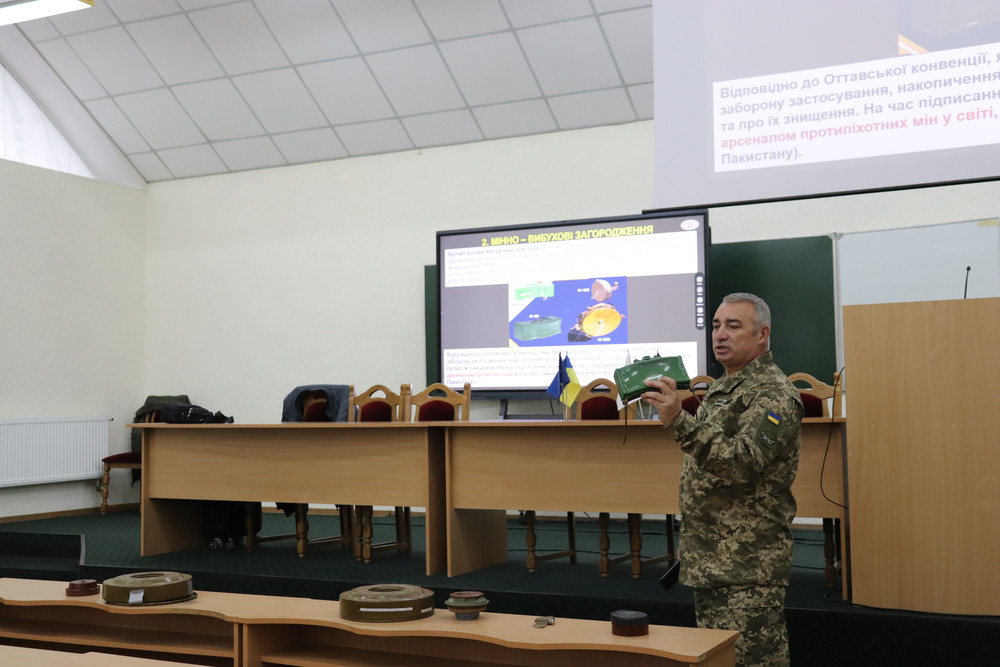 Полковник Ігор Красота провів для студентів заняття з інженерної підготовки в межах навчальної дисципліни «Базова загальна військова підготовка» і розповів зокрема про міни, їхні види, невибухові загородження, а також правила безпечної поведінки з ними.