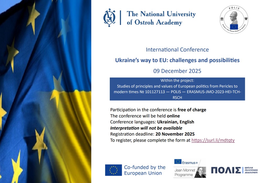 9 грудня 2025 року відбудеться міжнародна конференція «Шлях України в ЄС: виклики і можливості». Цей науковий захід буде проводитися в рамках реалізації проекту «Студії принципів та цінностей європейської політики від Перікла до сучасності» (Studies of principles and values of European politics from Pericles to modern times № 101127113 — POLIS — ERASMUS-JMO-2023-HEI-TCH-RSCH).