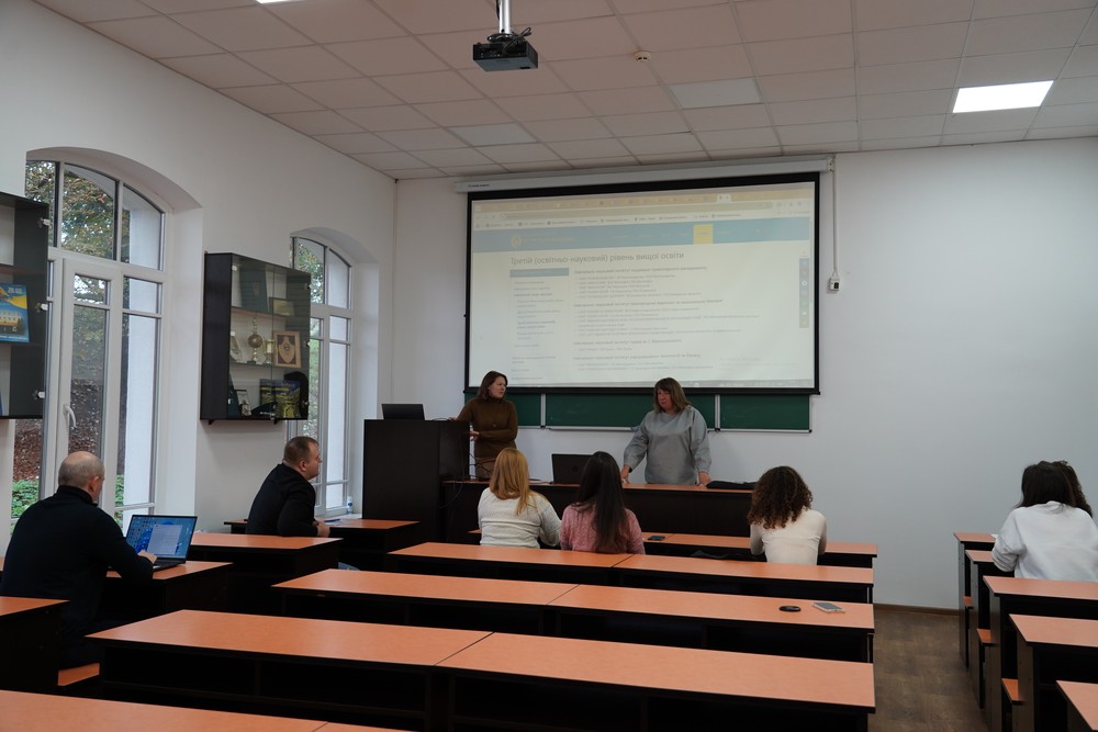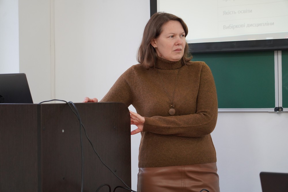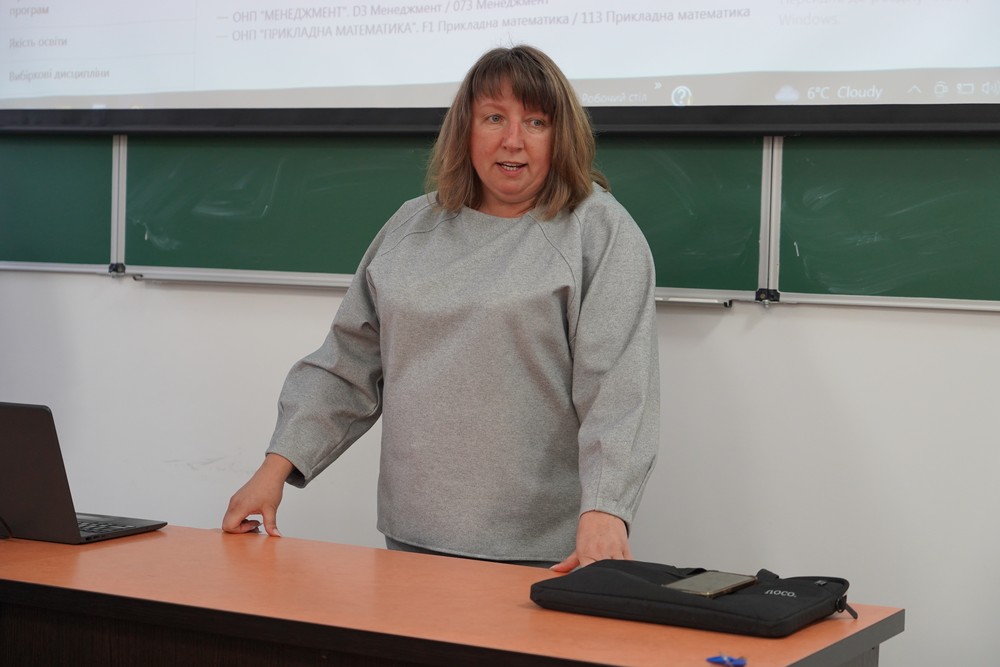 Катерина Якуніна, кандидатка історичних наук, доцентка, помічниця ректора зі стратегічного розвитку та забезпечення якості освіти, презентувала аспірантам інформаційні ресурси університету, які допомагають ефективно працювати з науковими матеріалами та інтегруватися у глобальну академічну спільноту. Вона також наголосила на дотриманні принципів Кодексу академічної доброчесності, які є невід’ємною складовою якісного й відповідального дослідження: