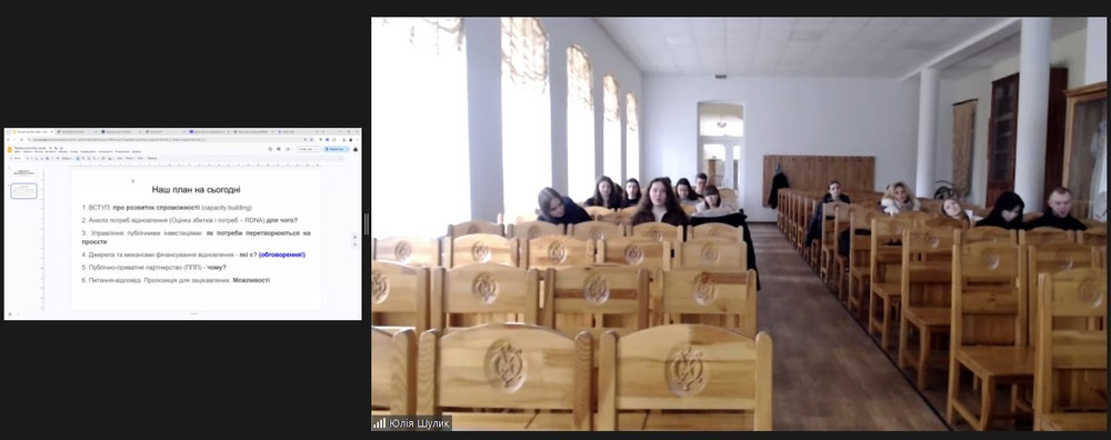 Під час лекції спікер розповів про розвиток спроможності (capacity building), аналіз потреб відновлення (оцінку збитків і потреб RDNA), управління публічними інвестиціями (перетворення потреб на проєкти), джерела та механізми фінансування відновлення, публічно-приватне партнерство тощо.