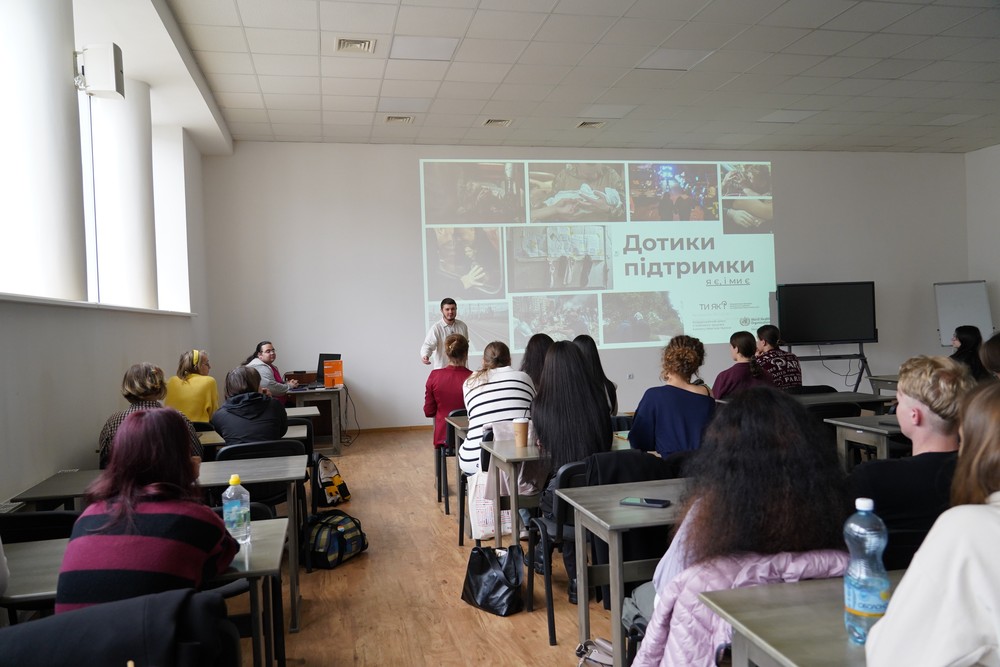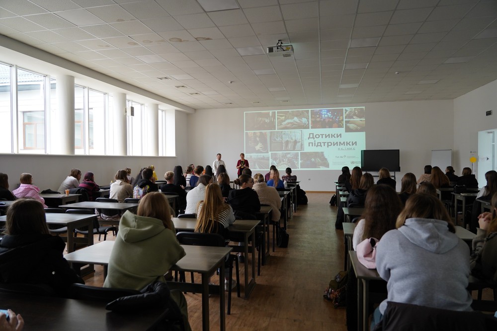 «Сьогодні ми говорили про те, які дотики підтримки можуть бути загалом: тілесні, предметні, побутові, соціальні й духовні. Це про вміння допомогти з побутовими речами, послухати, побачити, побути поруч мовчки тощо. Обговорювали зі студентами тенденції в Україні і на що ми можемо вплинути. Запропонували їм долучитись до ініціативи й записати історію власної стійкості на платформі»,