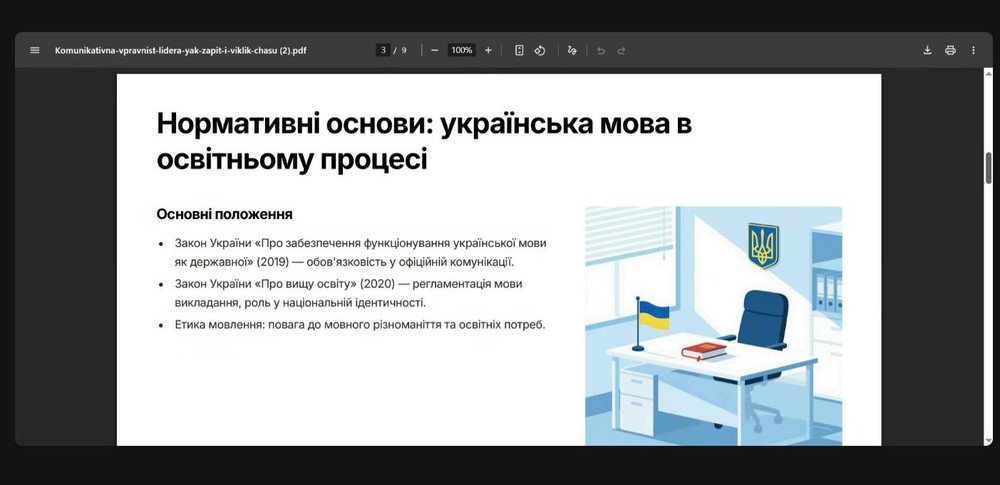 Під час лекції Зоя Столяр закцентувала увагу на основних акцентах для комунікатора, де комунікація – міст між лідером і командою; продемонструвала нормативні основи, що регламентують мову й визначають вимоги до неї як до основного інструмента управління, зокрема в освітньому процесі, й пояснила, як вправне спілкування впливає на репутацію лідера.