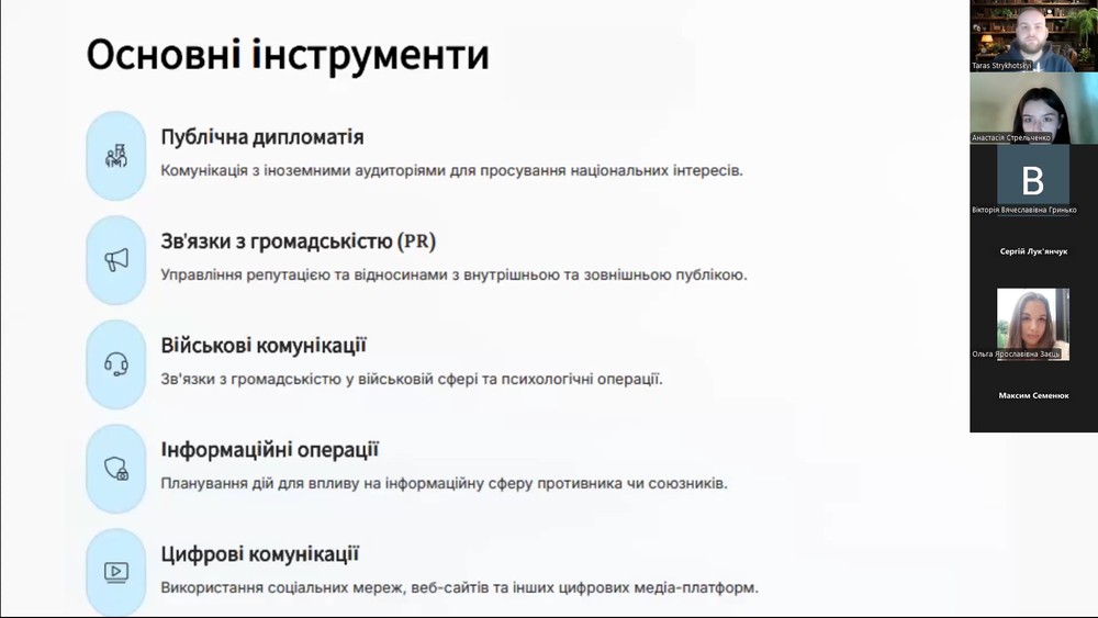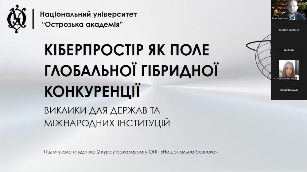 Загалом під час доповідей і жвавих обговорень йшлося про роль різних гравців на міжнародній арені (США, Китаю, Європейського Союзу, Туреччини, Індії, Непалу та ін.) в контексті протидії гібридним загрозам і впливу на сучасну архітектуру безпеки, різні інструменти для ефективної протидії гібридним впливам (системи кризового менеджменту, дипломатію, національну стійкість, стратегічне планування та ін.), інформаційний і кібер- простори як сучасні «поля бою». Подія стала платформою для обговорення результатів наукових досліджень молодих дослідників, які вже мають досвід участі в схожих заходах, так і була свого роду успішним «науковим дебютом» для низки учасників.