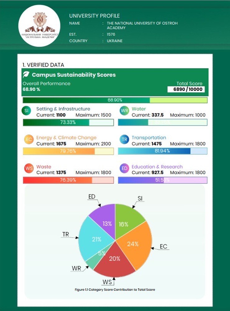 Зокрема, Острозька академія посіла перше місце за рівнем екологічного використання енергії та змін клімату, випередивши всі інші українські університети. За рівнем екологічності використання транспортних засобів, показників облаштування та інфраструктури, управління відходами наш університет піднявся на другу сходинку серед українських ЗВО.