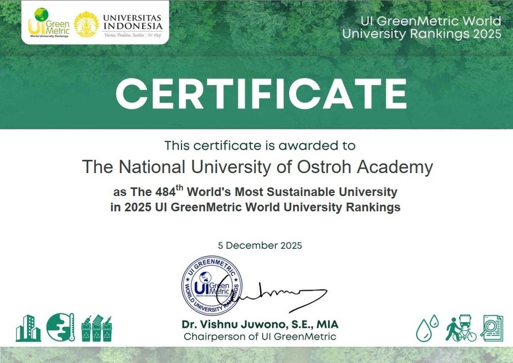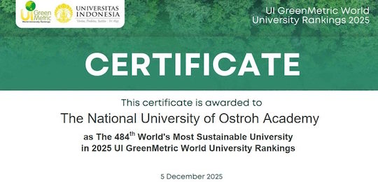 За цьогорічними результатами світового рейтингу UI GreenMetric World University Rankings 2025 Національний університет «Острозька академія» посів 3 місце із 33 українських ЗВО, що представлені у цьогорічному рейтингу, і загалом 484 місце у світі із 1754 університетів зі 105 країн світу.