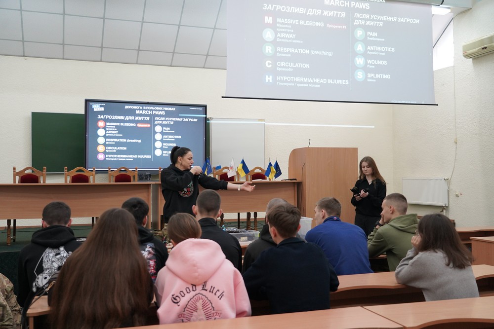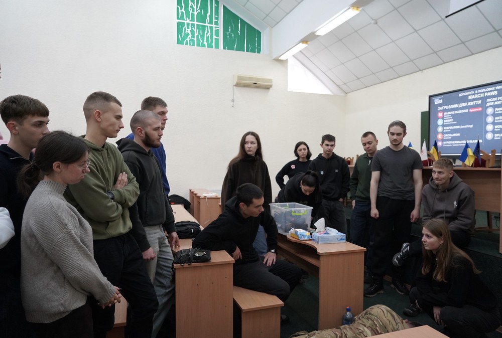 Під час тренінгу студентам розповіли про алгоритм MARCH – послідовність дій у тактичній медицині, яка використовується для оцінки й надання першої допомоги постраждалим у бойових умовах або під час надзвичайних ситуацій. Головна мета MARCH – врятувати життя, діючи за пріоритетами, які зменшують ризик смерті.