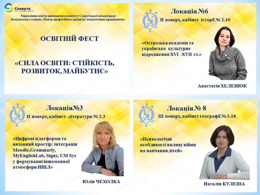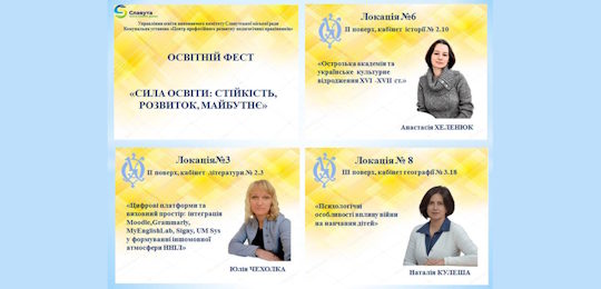 Національний університет «Острозька академія» долучився як партнер до освітнього фесту «Сила освіти: стійкість, розвиток, майбутнє», що відбувся на базі Славутського ліцею. Організатори заходу — Управління освіти виконавчого комітету Славутської міської ради та КУ «Центр професійного розвитку педагогічних працівників».