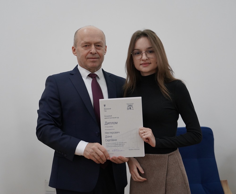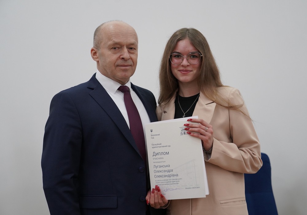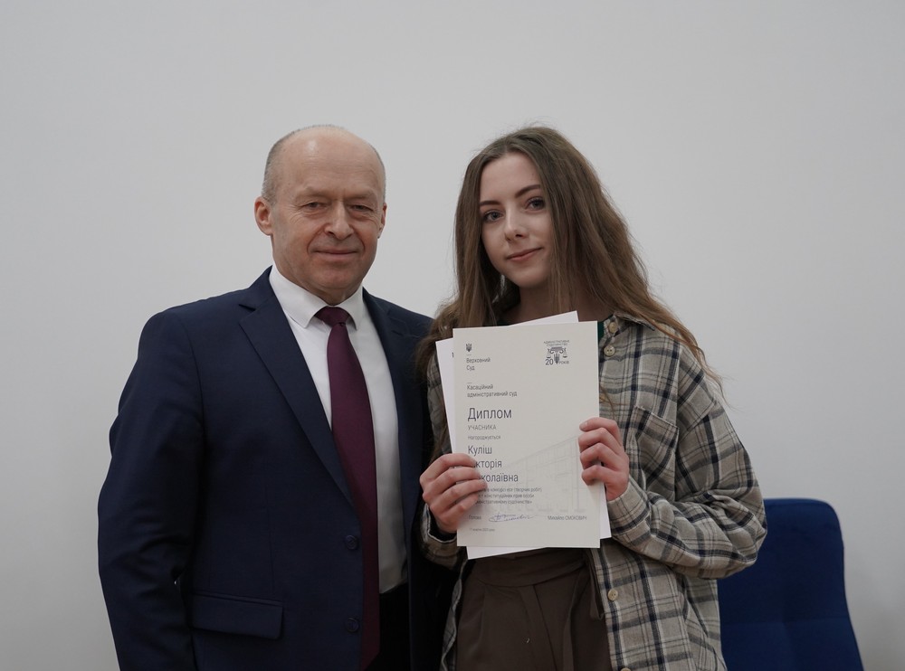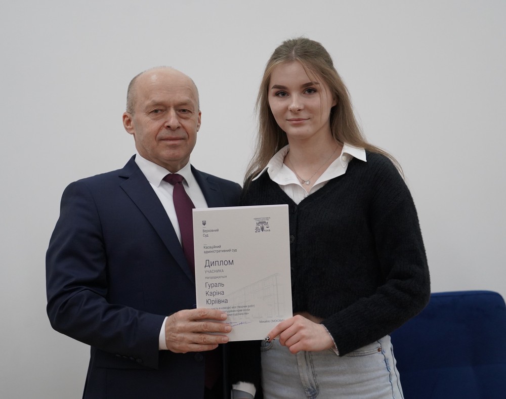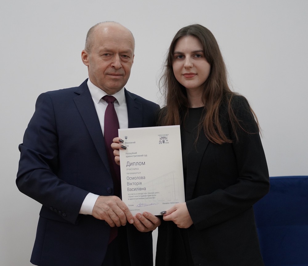 Після вітальних слів голова Касаційного адміністративного суду у складі Верховного Суду Михайло Смокович оголосив призерів творчого конкурсу на краще есе на тему «Захист конституційних прав особи в адміністративному судочинстві», а також вручив диплом переможниці студентці 3-го курсу спеціальності «Право» Острозької академії Вікторії Вакулінській і дипломи учасників – студентам університету, які теж долучились до конкурсу.