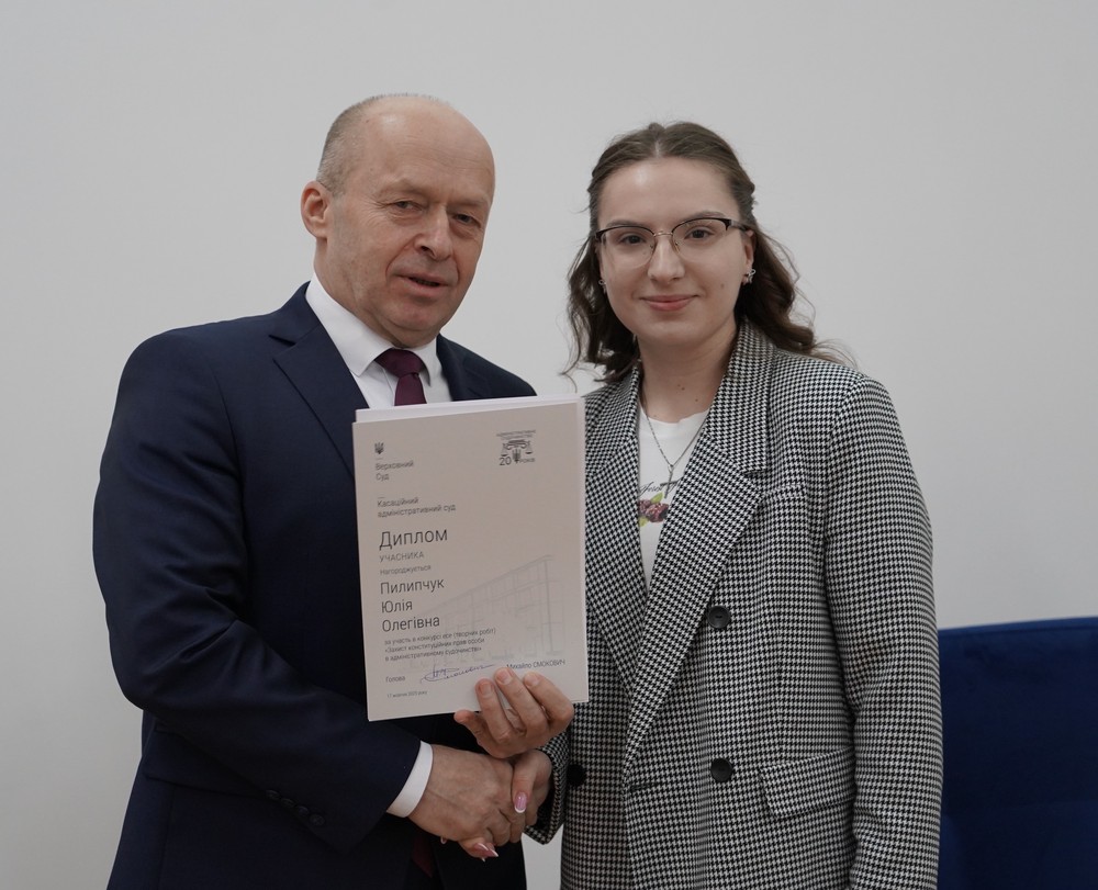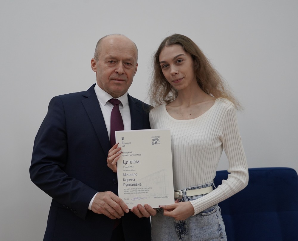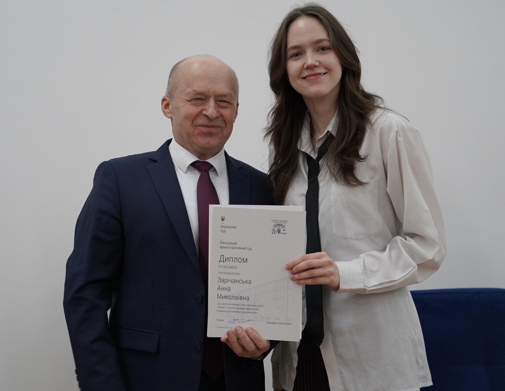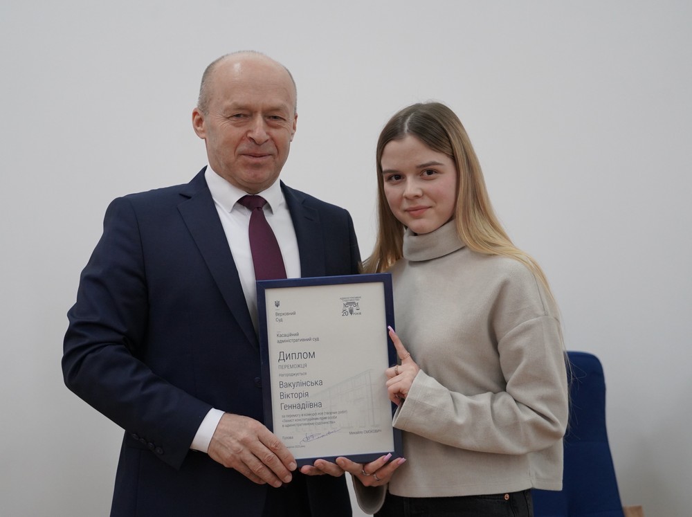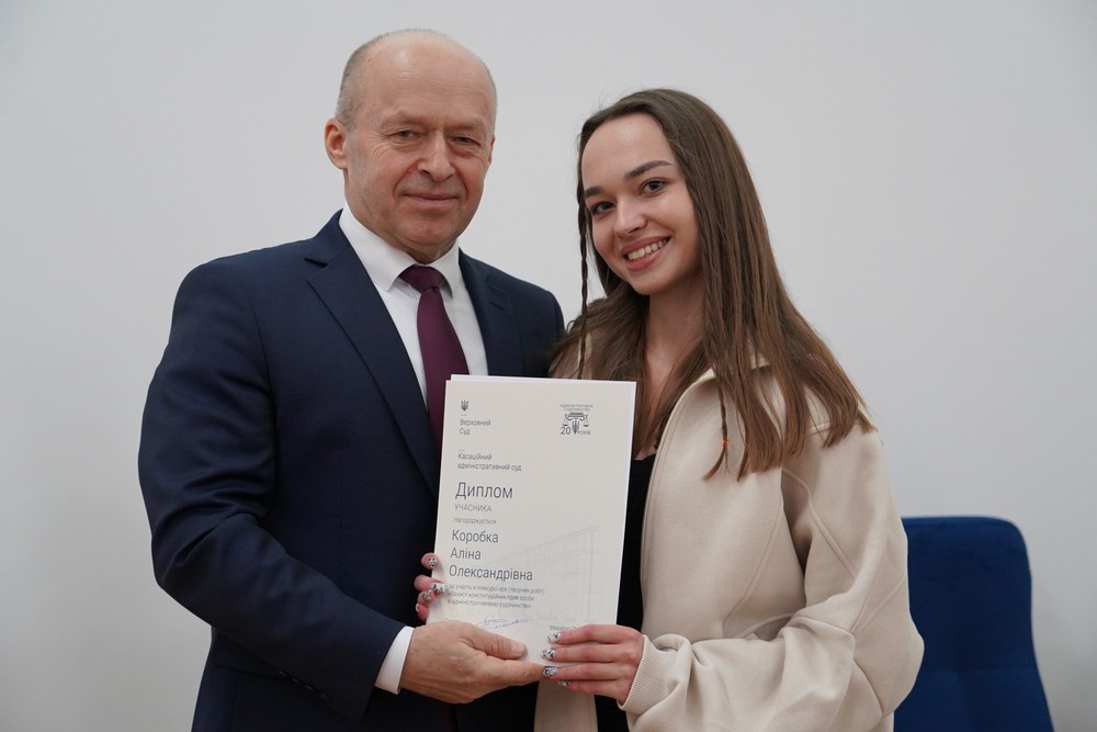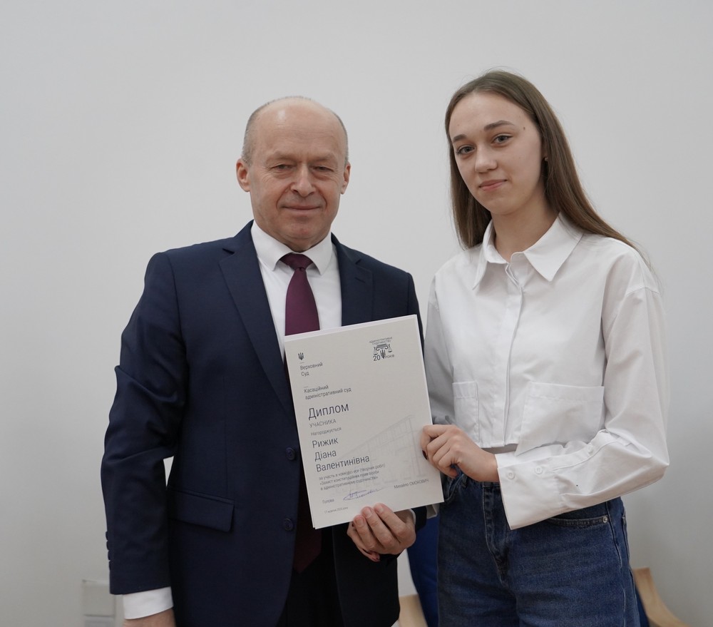 Після вітальних слів голова Касаційного адміністративного суду у складі Верховного Суду Михайло Смокович оголосив призерів творчого конкурсу на краще есе на тему «Захист конституційних прав особи в адміністративному судочинстві», а також вручив диплом переможниці студентці 3-го курсу спеціальності «Право» Острозької академії Вікторії Вакулінській і дипломи учасників – студентам університету, які теж долучились до конкурсу.