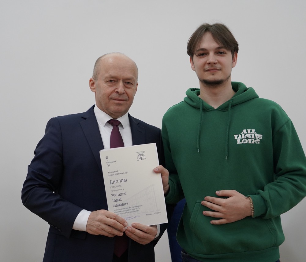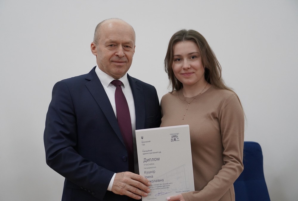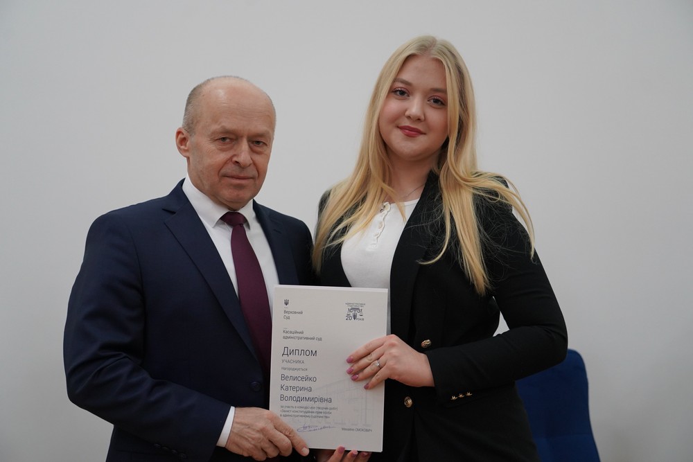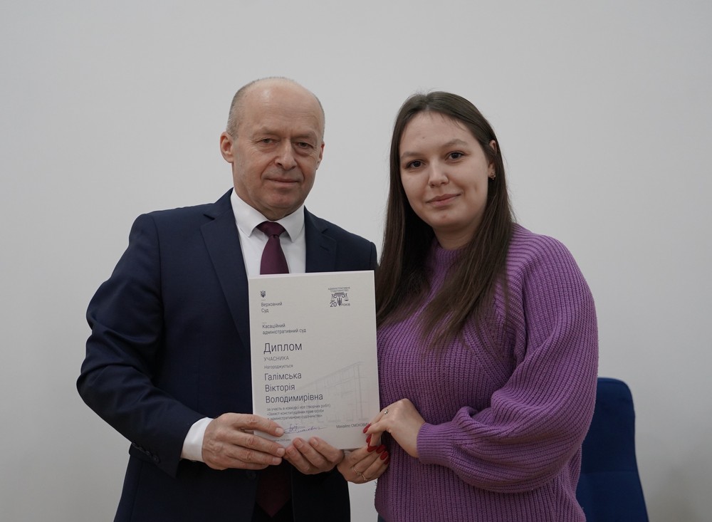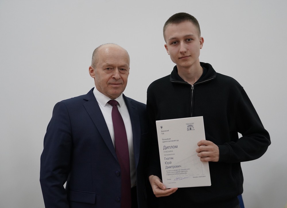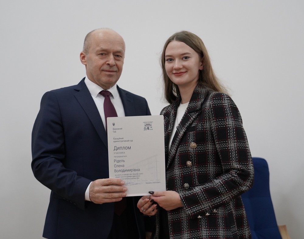 Після вітальних слів голова Касаційного адміністративного суду у складі Верховного Суду Михайло Смокович оголосив призерів творчого конкурсу на краще есе на тему «Захист конституційних прав особи в адміністративному судочинстві», а також вручив диплом переможниці студентці 3-го курсу спеціальності «Право» Острозької академії Вікторії Вакулінській і дипломи учасників – студентам університету, які теж долучились до конкурсу.