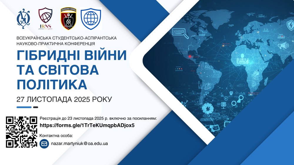 У межах виконання проєктів «WARN: Академічна протидія гібридним загрозам» і «Моделювання та аналіз процесів інформаційної війни як інструмент захисту демократії в ЄС та протидії загрозам» запрошуємо взяти участь у Всеукраїнській студентсько-аспірантській науково-практичній конференції «Гібридні війни та світова політика».