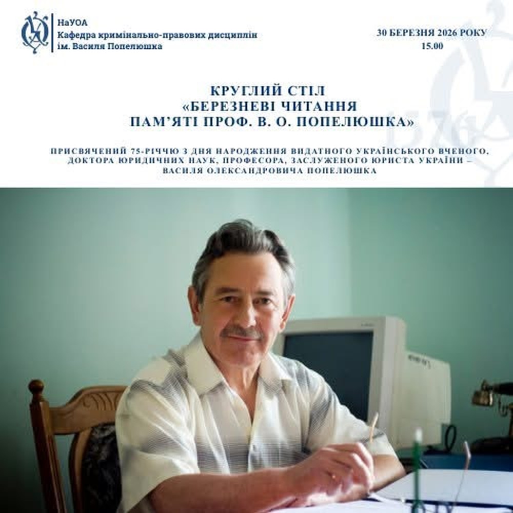 Запрошуємо вас взяти участь у роботі щорічного круглого столу «Березневі читання пам’яті проф. В. О. Попелюшка», присвяченому вшануванню внеску видатного українського вченого, доктора юридичних наук, професора, Заслуженого юриста України, теоретика та практика, який глибоко відчував дух правничої професії, – Василя Олександровича Попелюшка – в розбудову української правничої школи та обговоренню актуальних проблем кримінального процесу, криміналістики, судоустрою та адвокатури, яким професор присвятив свій професійний шлях.