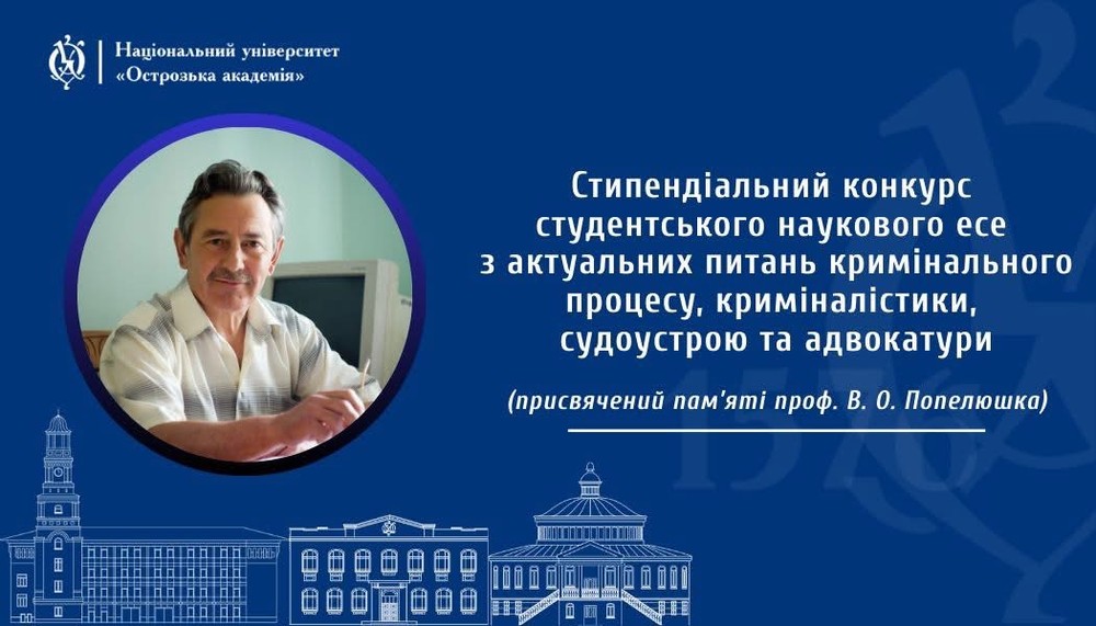 Запрошуємо здобувачів першого (бакалаврського) та другого (магістерського) рівнів вищої освіти Національного університету «Острозька академія», які навчаються за спеціальністю D8/081 Право, взяти участь у Стипендіальному конкурсі студентського наукового есе з актуальних питань кримінального процесу, криміналістики, судоустрою та адвокатури, присвяченому пам’яті професора В. О. Попелюшка.