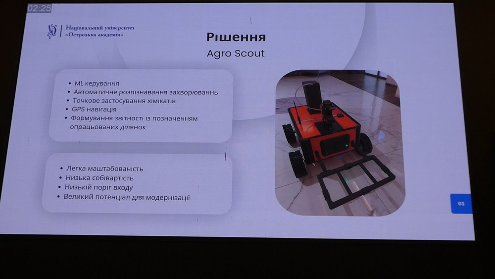 У межах хакатону команда Національного університету «Острозька академія» «0xRA» представила прототип наземного робота-дрона для малого та середнього бізнесу в агросекторі, який студенти розробили завдяки роботі в Науково-дослідній лабораторії «Робототехніки та вбудованих систем з прикладним АІ». Участь у такому масштабному міжнародному заході стала важливим досягненням не лише для самих студентів, а й для університетської спільноти загалом, адже засвідчила високий рівень підготовки молодих фахівців у сфері сучасних технологій.