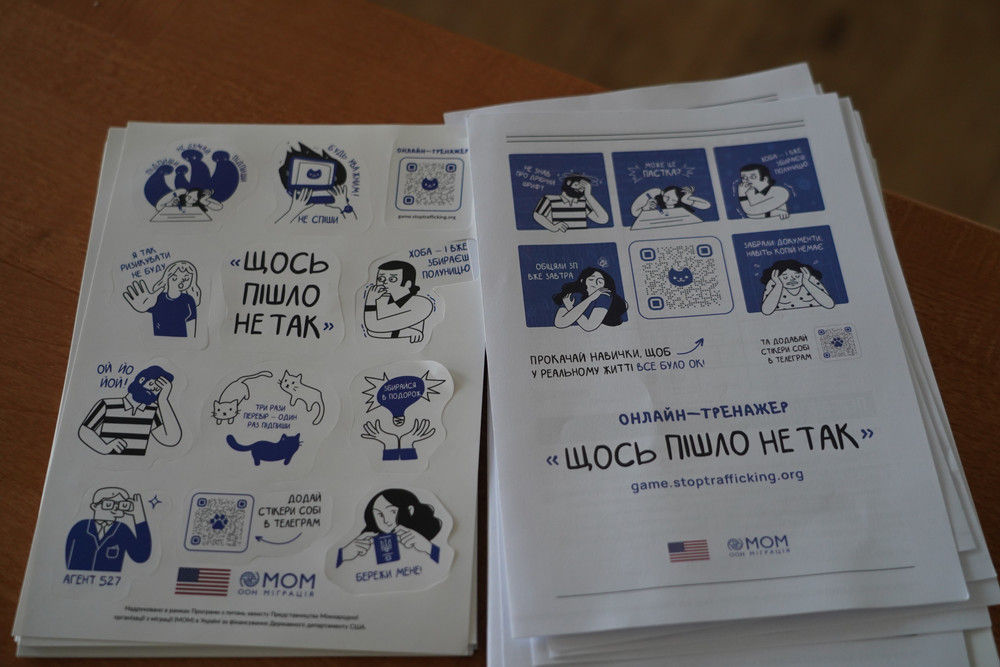 Студенти отримали листівки й наліпки, де містяться QR-коди на онлайн-активності з теми протидії торгівлі людьми: квест «Безпечне працевлаштування» та гру «Щось пішло не так».