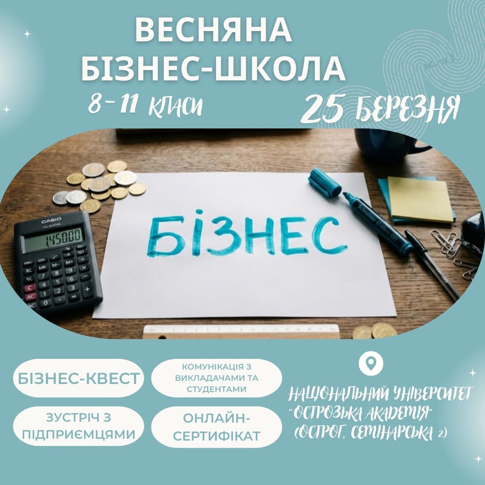 Команда студентів і викладачів кафедри фінансів та бізнесу Національного університету «Острозька академія» запрошує учнів 8-11 класів взяти участь у Весняній бізнес-школі, яка відбудеться 25 березня 2026 року!