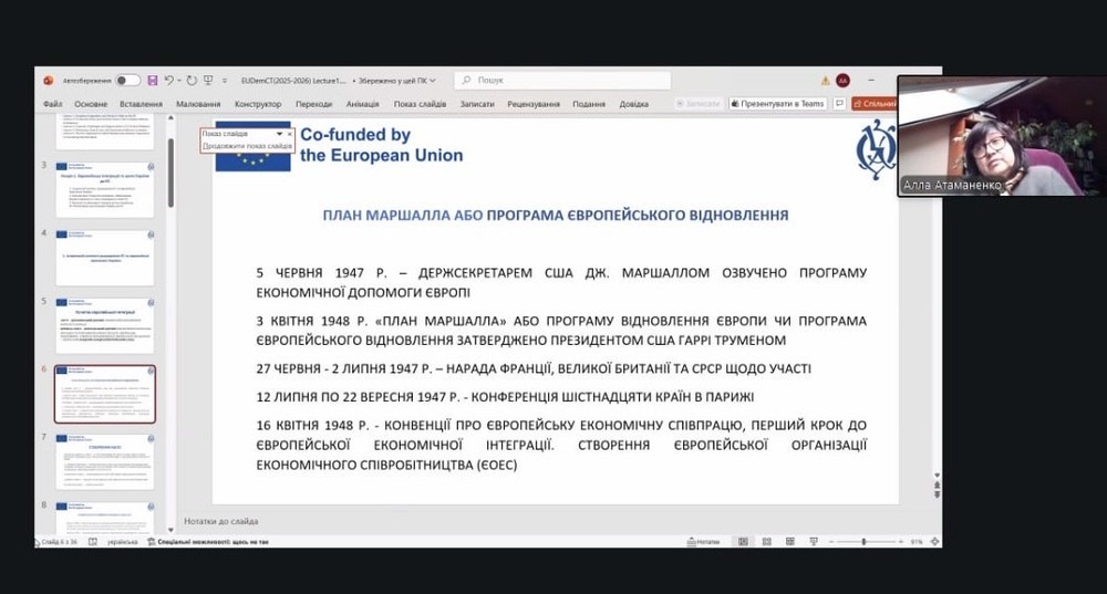 Першу лекцію для слухачів курсу на тему «Європейська інтеграція та шлях України до Європейського Союзу» прочитала докторка історичних наук, професорка, професорка кафедри міжнародних відносин та керівниця Лабораторії дослідження гібридних загроз Алла Атаманенко.