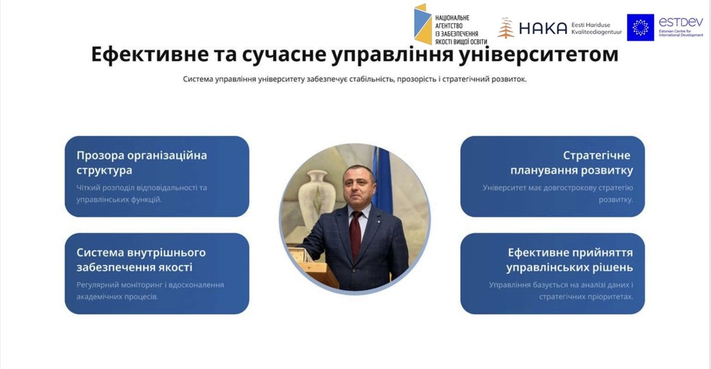 Нагадаємо, що інституційна акредитація проводилася у співпраці Естонського агентства із забезпечення якості (HAKA) з Національним агентством із забезпечення якості вищої освіти (НАЗЯВО) та стала частиною проєкту «Підвищення якості вищої освіти в Україні», що фінансується Естонським центром міжнародного розвитку (ESTDEV).