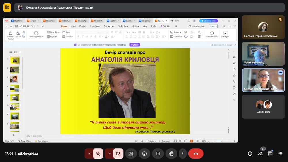 19 лютого в Національному університеті «Острозька академія» відбувся вечір спогадів про Анатолія Криловця «Я тому саме в травні лишаю життя, щоб його цінували учні...», організований викладачами катедри української мови і літератури – колегами й учнями світлої пам’яті вченого й поета.