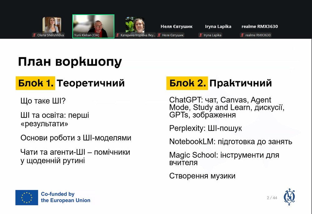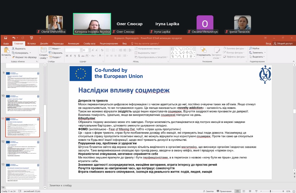 Окрему увагу під час воркшопу було приділено аналізу маніпулятивних технік у медіапросторі, розпізнаванню дезінформації та формуванню критичного мислення. Учасники також дослідили механізми функціонування соціальних мереж, зокрема принципи «економіки уваги» та алгоритмічні інструменти впливу на поведінку користувачів. У межах заходу розглядалися питання безпечного та етичного використання соціальних медіа в професійній діяльності вчителя/вчительки в умовах воєнного часу, а також можливості застосування штучного інтелекту для освітньої комунікації.