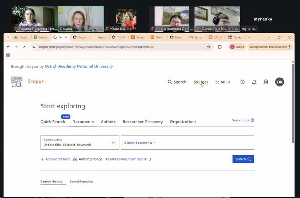 Фахівчиня наукового відділу, завідувачка сектору читальних залів Наукової бібліотеки Оксана Кравченко розповіла про ознаки «хижацьких» видань і перевірку в базах Scopus & Web of Science індексування журналу. Також пані Оксана закцентувала увагу на тому, як за допомогою WoS у Master Journal List підібрати журнали для публікації відповідно до назви й анотації запропонованої статті.