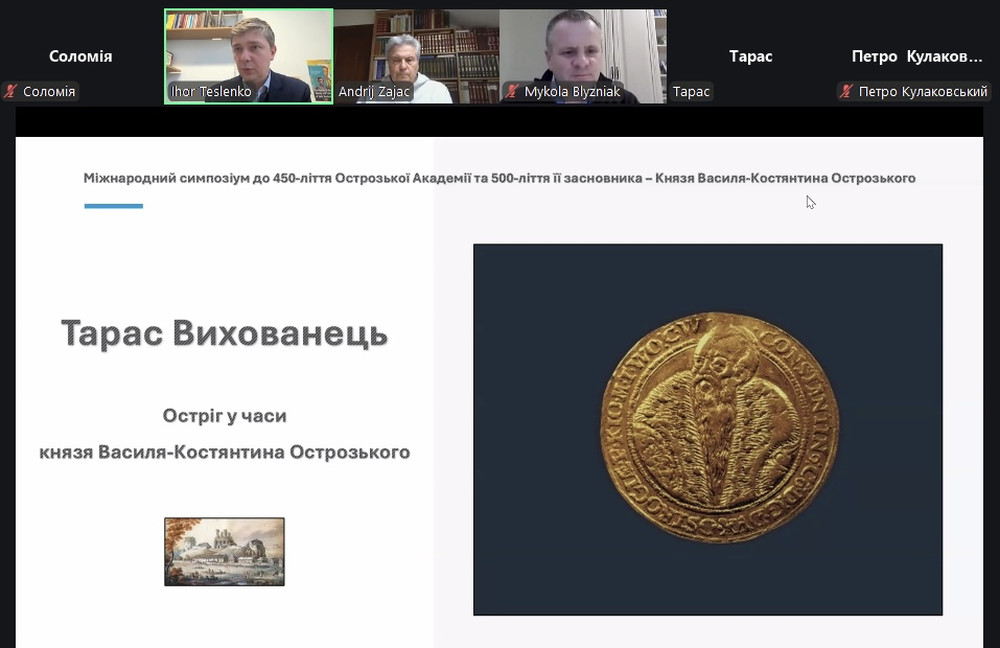 - кандидат історичних наук, доцент кафедри історії ім. проф. М.П. Ковальського НаУОА Микола Близняк. Тема доповіді – «Руська громада Острога в останній третині XVI – на початку XVII століття»;