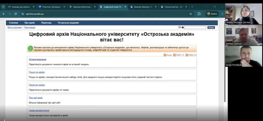 Під час першої частини семінару говорили про Цифровий архів (репозитарій). Директорка Наукової бібліотеки Галина Цеп’юк наголосила на тому, що це не просто електронний архів, а важливий інструмент університету й інтеграції вчених Острозької академії у світовий науковий простір.
