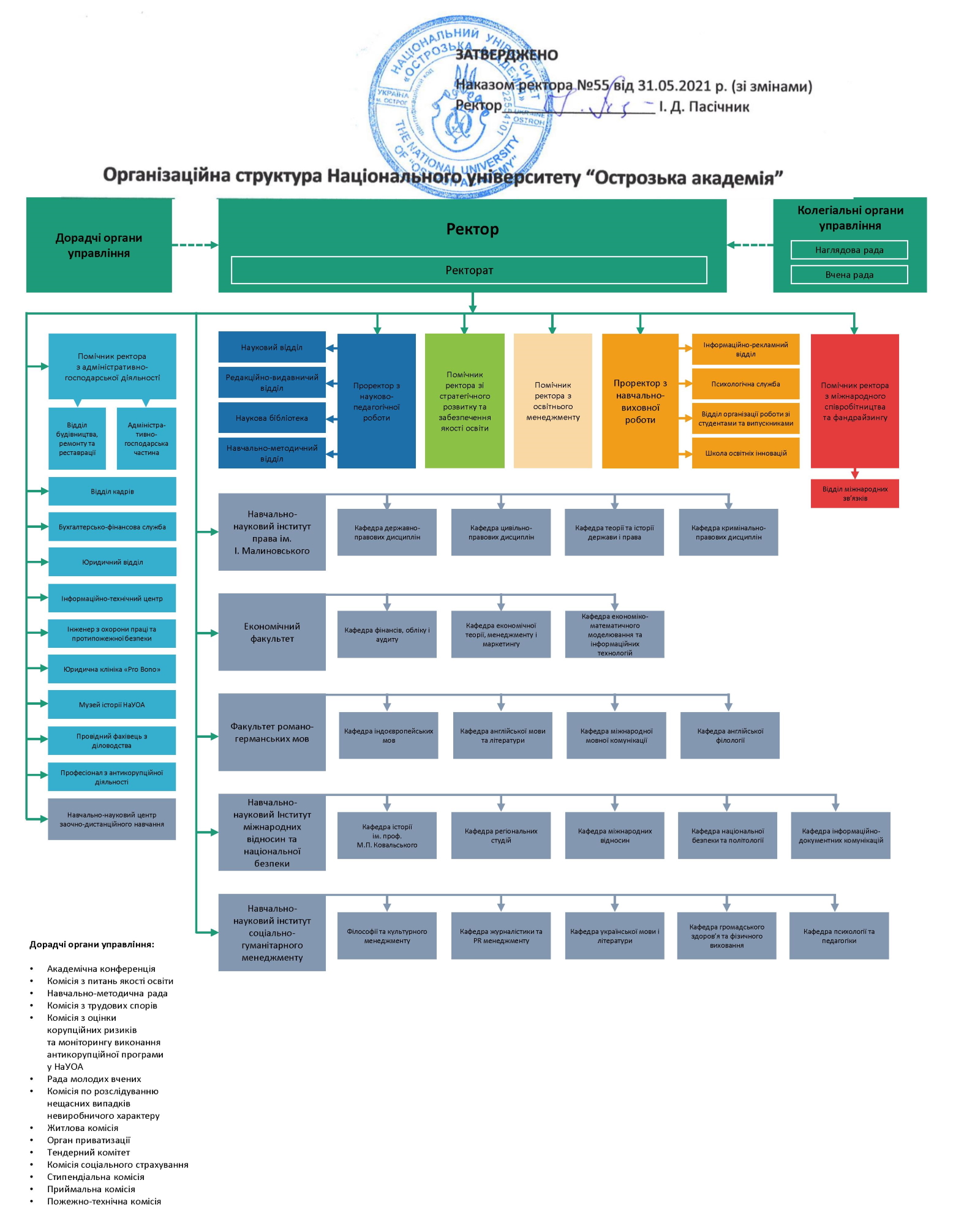 В Національному університеті «Острозька академія» діє 2 факультети, 3 навчально-наукових інститути та Навчально-науковий центр заочно-дистанційного навчання.